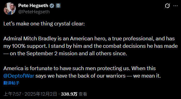 “让我们澄清一件事,布拉德利是一位美国英雄,一位真正的专业人士,我100%支持他,”赫格塞思写道,“我支持他以及他做出的作战决定,包括9月2日的任务以及此后的所有任务。”